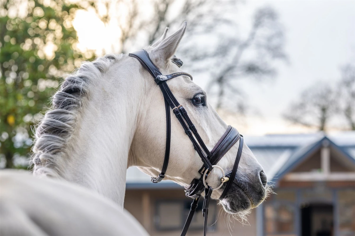 The LeMieux Dressage bridle is a classic example with a contemporary twist and is just made for the ring. The delicate, detachable clincher browband is anatomically shaped and complements the statement padded crank noseband beautifully. For additional comfort, the crank pad has excellent cushioning and roller buckles on the crank strap and flash. The throat lash fastens discretely under the jaw for a slimline look. This bridle comes in brown with silver fittings and matches the brown Straight Rubber Reins with silver buckle. The LeMieux Bridles are made from beautifully soft European leather and feature an anatomically shaped headpiece with soft padded cut away around the ears and poll to aid in the distribution of pressure, maximising comfort. Delicate, detachable shaped clincher browband. Statement padded crank noseband. Crank pad has excellent cushioning for maximum comfort. Roller buckles on the crank strap and flash. Throat lash does up discretely under the jaw. Colours: Black with Silver Fittings and Brown with Silver fittings Matches the Straight Rubber Reins Reins sold separately.
