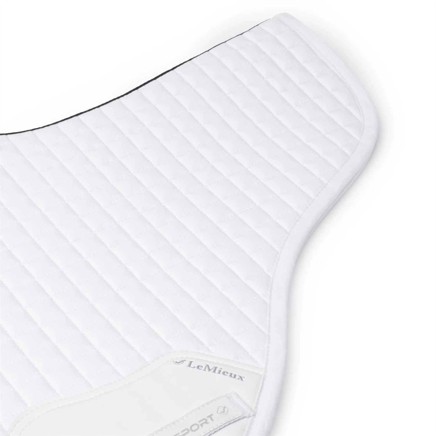 The LeMieux plain cotton Half Square is designed for the competitive rider offering modern style & performance. The more streamline half cut profile is cooler than a full square and less bulky, making it one of the least restrictive jumping pads. With its high wither, elasticated D-Ring tabs and signature teardrop girth protection area this is a very sporting looking pad. Popular around the world for use in competition, especially in hotter climates. These technically conceived pads have high quality fabric structure enabling them to retain shape & resist shrinkage. Inner lining of cotton is soft whilst breathing and managing heat & sweat. All have the familiar LeMieux high wither and girth protection areas with new locking loops. Contoured elasticated D-Ring straps also feature on many pads.