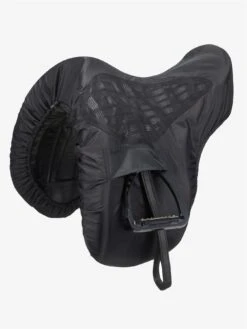 The silicone grip seat of the ProKit Ride On Saddle Cover gives the rider perfect stability in the saddle, minimizing movement and finally making riding in the wet easy whilst protecting the saddle from the elements. The saddle cover is made of a durable, waterproof polyester outer with a soft fleece lining to protect the saddle. Waterproof rating of 3000mm. The adjustable elastic drawstring allows it to fit most shapes and sizes of Dressage saddle for a snug fit. Stirrup slits allow for easy access to pass stirrups through and a lower slot at the bottom on each side is designed to pass the girth straps through for added security. Fits 16″ – 18″ saddle.
